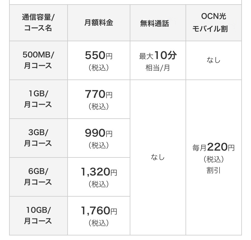 最安プランは月500MB(0.5GB)で税込550円からとなっています。