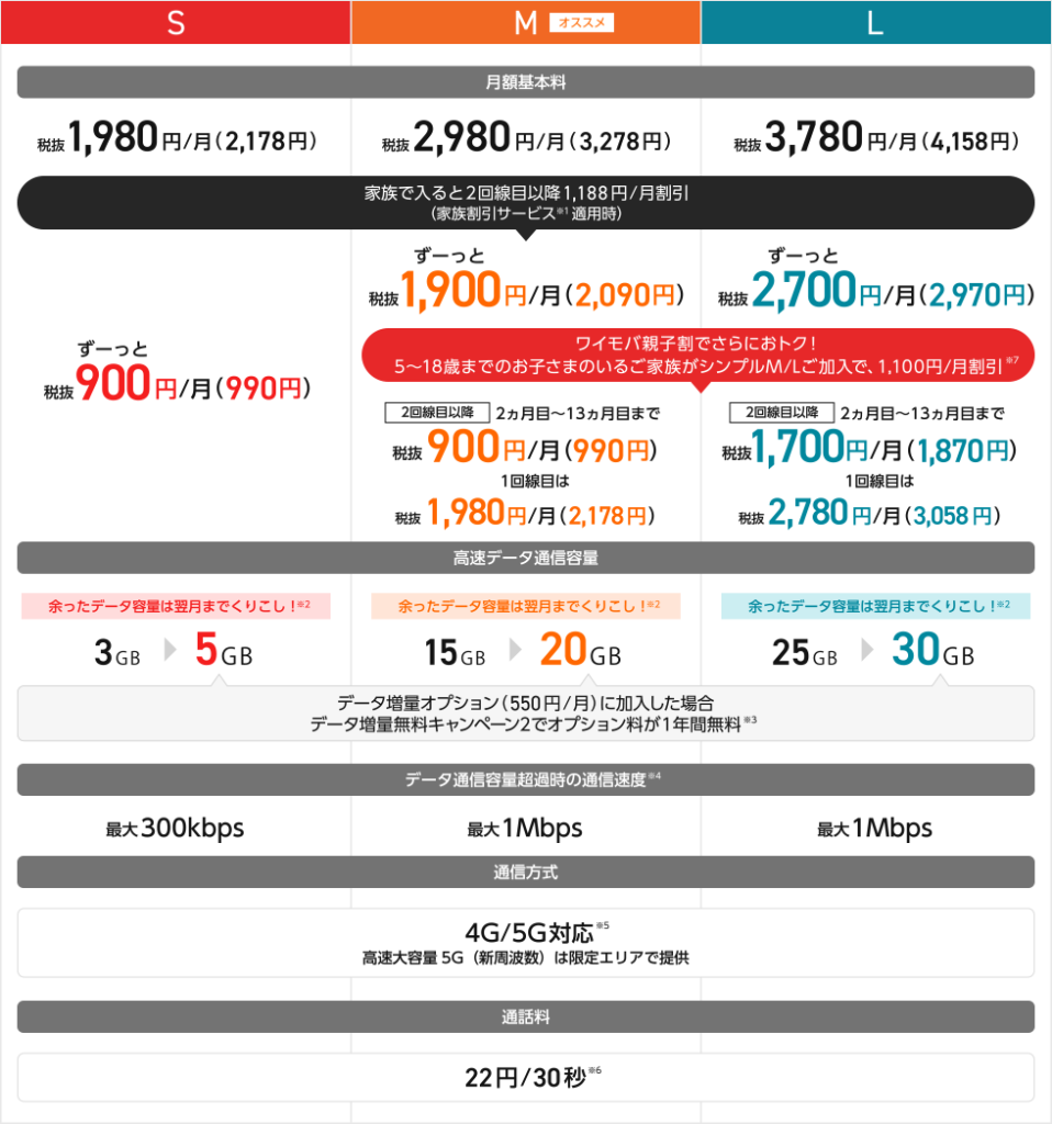 プラス月額550円でシンプルSが3GB⇒5GB、Mが15GB⇒20GB、Lが25GB⇒30GBに増量。